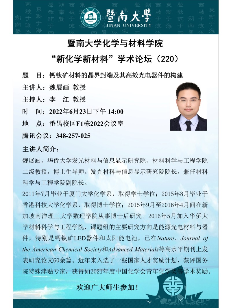 题 目:钙钛矿材料的晶界封端及其高效光电器件的构建