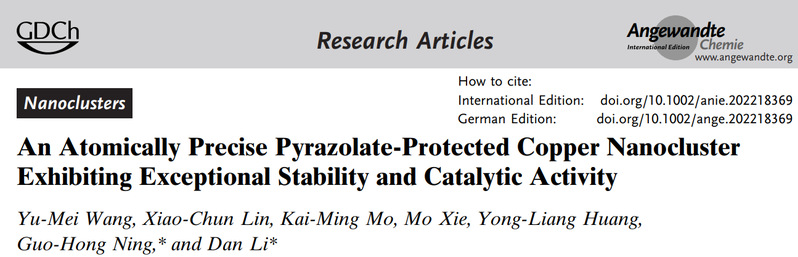 近日,必赢bwin唯一官方宁国宏/李丹教授团队以必赢bwin唯一官方为唯一通讯单位于2022年12月28日,在Angewandte Chemie International Edition(IF=16.8)上发表了题为 “An Atomically Precise Pyrazolate-Protected Copper Nanocluster Exhibiting Exceptional Stability and Catalytic Activity” 的重要研究成果(图1)。