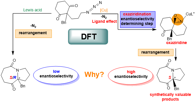 该论文借助理论计算化学的优势,基于密度泛函理论,对过渡金属铜催化的不对称串联氧氮杂环丙烷化反应和路易斯酸催化的不对称Schmidt反应进行了详细的机理研究与对比,解释了为什么金属铜催化剂可以获得高对映选择性,证明了双恶唑啉型大配体是高对映选择性的必要条件,该研究有助于未来开发具有高立体选择性的不对称转化催化剂。
