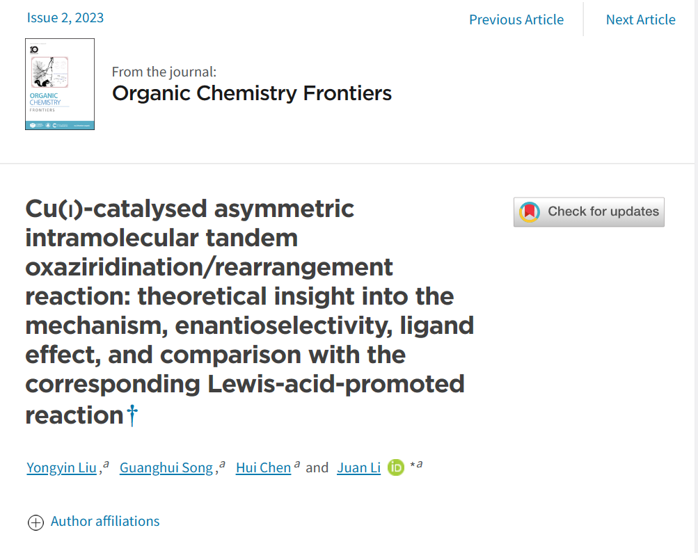 近日,必赢bwin唯一官方2020级应用化学2班本科生刘咏茵以第一作者(指导老师:李娟)在有机化学领域知名期刊Organic Chemistry Frontiers发表题为Cu(Ⅰ)-catalysed asymmetric intramolecular tandem oxaziridination/rearrangement reaction: theoretical insight into the mechanism, enantioselectivity, ligand effect, and comparison with the corresponding Lewis-acid-promoted reaction的研究论文。该期刊为有机化学学科旗舰刊物,中科院JCR1区收录,影响因子5.456。
