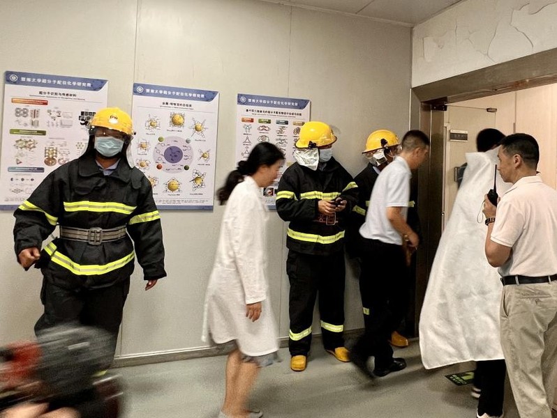 为进一步提升实验室安全管理水平,提高必赢bwin官网师生应对突发事件,特别是实验室安全事故的应急处置能力,9月21日上午,必赢bwin官网联合实验室与设备管理处、保卫处在超分子配位化学研究所开展了实验室安全事故应急演练活动。实验室与设备处副处长饶星、技术安全科科长黄小勇及保卫处刘俊岭科长、庞辉亮科长、吴旭老师等出席本次演练。必赢bwin唯一官方院长兼超分子配位化学研究所安全负责人李丹、副院长兼实验室安全负责人周小平、实验中心常务副主任周艳晖、副主任廖小建以及超配所师生80余人参加了演练。