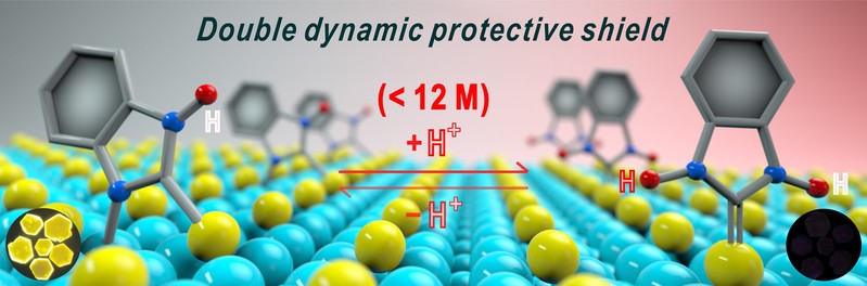 研究者利用核磁氢谱、红外光谱、拉曼光谱以及光电子能谱等表征手段系统研究了S−X样品在强酸液浸泡前后的表面结构,证明该层状配位聚合物的表面存在双重动态保护行为:1)表面配体有机壳层(即苯环)的疏水作用;2)硫醇-硫酮可逆互变异构行为形成有效动态质子缓冲层。理论计算研究表明,层状配位聚合物中的TBI配体在酸性条件下的质子化行为,在热力学上更有利于促进二维层中Ag–N键的解离。此外,剥层后的S−X超薄样品可作为探测强酸浓度的荧光探针。