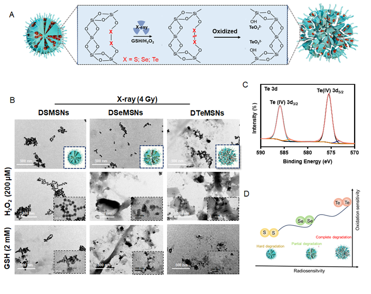 陈填烽团队一直致力于以临床问题为导向的化学创新药物设计与诊疗应用研究,聚焦于人体必需微量元素,在肿瘤靶向化学创新药物、硒纳米医学、肿瘤多模态精准诊疗等方面进行了开创性的工作。在Nat Comm、Signal Transduction and Targeted Therapy、Matter、Sci Adv、J Am Chem Soc、Angew Chem Int Ed、Adv Mater等本领域IF>10期刊发表论文100篇,封面论文40篇,h-index 83。近日,陈填烽团队基于同核双硒族元素构建纳米递送体系,探索了其对X 射线响应性用于肿瘤治疗。在该研究中,三种同核单键即S-S、Se-Se和 Te-Te键被桥接到介孔二氧化硅中,分别构建出有机无机杂化的纳米前药DSMSN、DSeMSNs和DTeMSNs,并系统研究了三种纳米前药对X-ray的响应性差异。基于它们的电负性、原子半径和键能(S-S,约 240 kJ/mol;Se-Se,约 172 kJ/mol;Te-Te,约126 kJ/mol)的差异,结果显示出对X-ray不同的氧化敏感性和反应性(DTeMSNs > DSeMSNs > DSMSNs)。 经过X-ray辐照后,DSMSNs 的形态几乎未发生变化, DSeMSNs出现部分裂解,DTeMSNs形貌则发生显著变化,且经过生化级联反应产生的TeO32- 能够进一步发挥化疗作用。